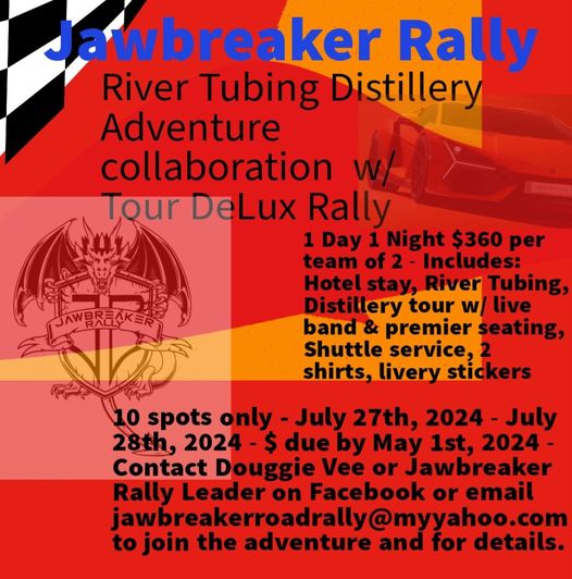 Jawbreaker Rally & Tour DeLux Rally are teaming up to bring you a great Rally into the twisties of Cambria County and leading us to a river rafting adventure then to a Distillery nightlife celebration with live music and premiere seating. This will be starting out in Pittsburgh. Cost is $360 per 2 person team. Includes hotel stay for 1 night, river tubing, 2 shirts, livery stickers, premier seating for the live band at the Distillery and shuttle service from hotel and back. Money will be due by May 1st for this adventure. 21 and up only. For registration, please reach out to douggie Vee or Jawbreaker rally leader on Facebook. You can also email us at jawbreakerroadrally@myyahoo.com